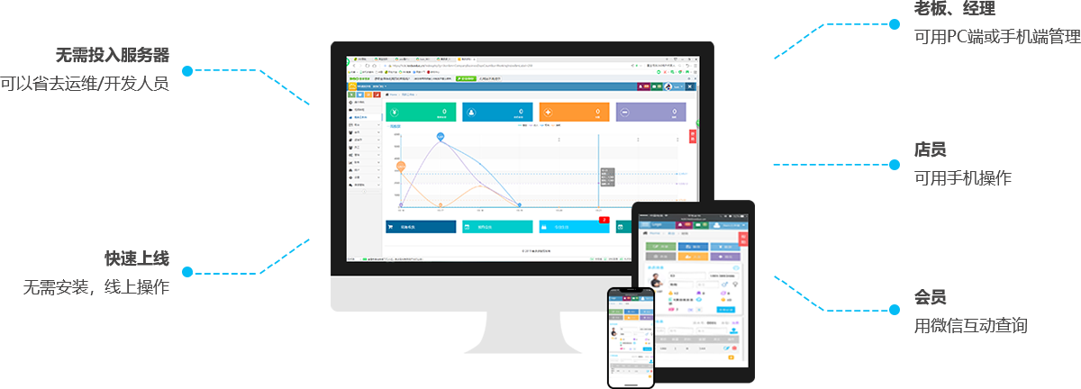 線下充值,線上消費。線下積分,線上兌換。一個后臺,總覽線上線下運營情況。